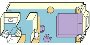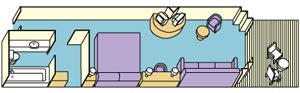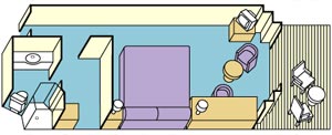 A mini-suite with balcony is substantially larger than a balcony stateroom. Accommodations include two twin beds that make up into a queen-size bed. A separate sitting area features a sofa bed and desk for lounging, entertaining or writing. Other amenities include a welcome glass of champagne, two televisions, a refrigerator and a walk-in closet. Your full bath includes a combined tub and massage shower head. Approximately 323 square feet, including balcony.