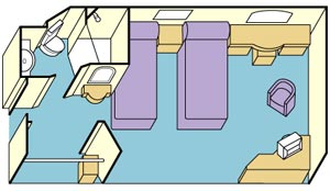 Our interior stateroom is a great value. It features two twin beds that make up into a queen-size bed. Other amenities include a refrigerator, television, closet and bathroom with shower. Approximately 160 square feet of space.